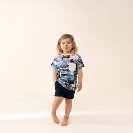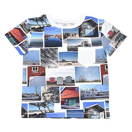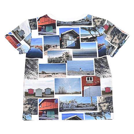 Kortärmad t-shirt med ebbes karaktäriska ficka fram, tillverkad i mjuk slubtrikå av ekologisk bomull. Tröjan har vackra fototryck med semesterbilder från den Svenska Västkusten