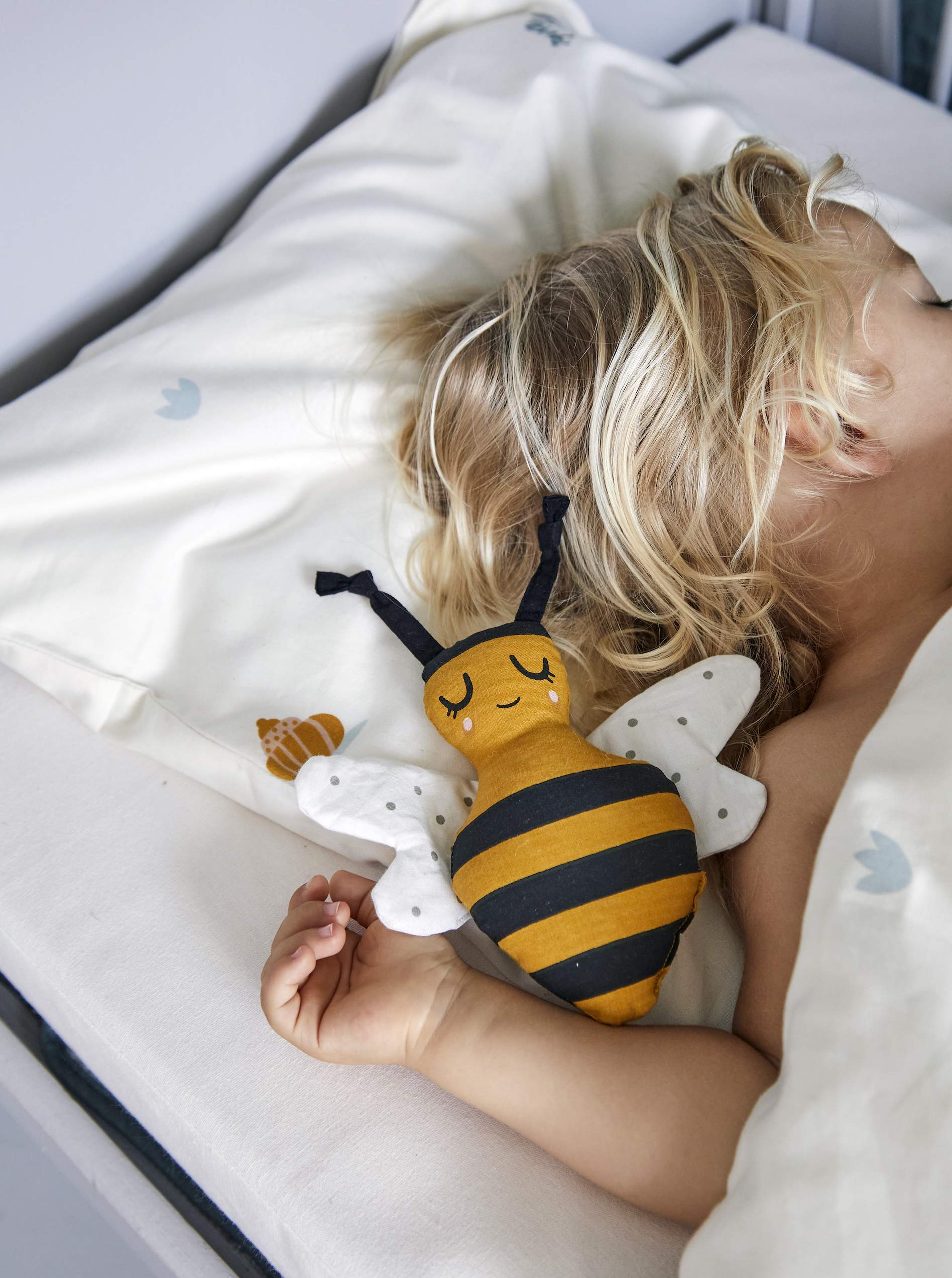 En kul mjuk skallra i form av ett bi med ljusa vingar, randig kropp i svart och ockra-gult, ett sött ansikte med blundande ögon och två antenner med knutar längst ut. OEKO-TEX certifierad med broderad design och tillverkad av 100% ekologisk bomull samt fylld med polyester. Tvättas i 30°C skontvätt och hängtorkas.