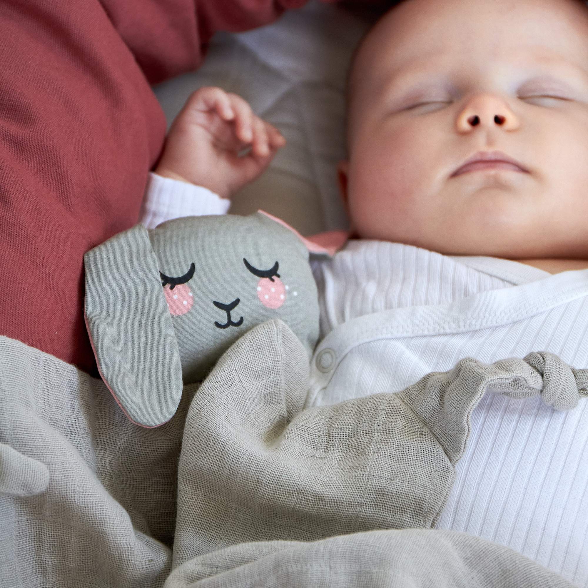 En snygg och söt ekologisk snuttefilt i ljusgrått, med ett stoppat kaninhuvud och knutar i alla fyra hörnen. Huvudet har ett blundande kaninansikte tryckt på ett tunt tyg och själva snuttefilten består av flera lager glesvävt och riktigt tunt tyg med ett invävt rutmönster. Oeko-tex certifierad och tillverkad av ekologisk bomull samt huvudet stoppat med polyesterfiber. Tvättas i maskin på 30°C skontvätt och hängtorkas.