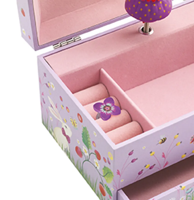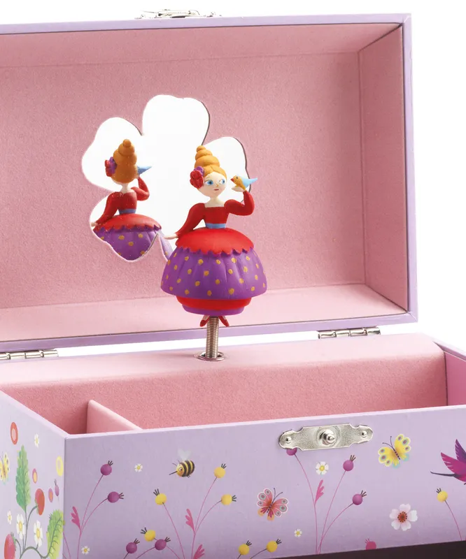 Smyckeskrin med speldosa. En prinsessa dansar till Trollflöjten av W. A. Morzart framför en spegel formad som en fyrklöver när du öppnar locket. Speldosan går att vrids upp med en liten nyckel på baksidan av skrinet. Under locket finns ett litet fack för mindre smycken så som ringar eller örhängen och ett större fack. Nedtill på skrinet finns en utdragbar låda.