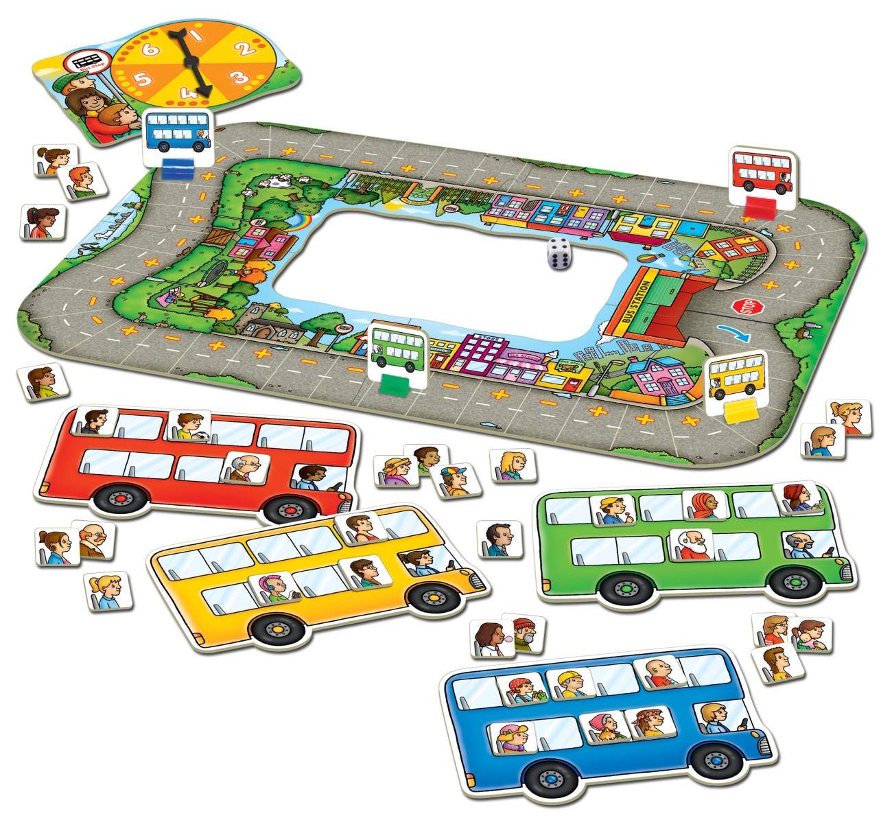 Kasta tärningen och se hur många passagerare som ska på eller av. Det gäller att ha så många passagerare som möjligt i din buss när den kommer till stationen.