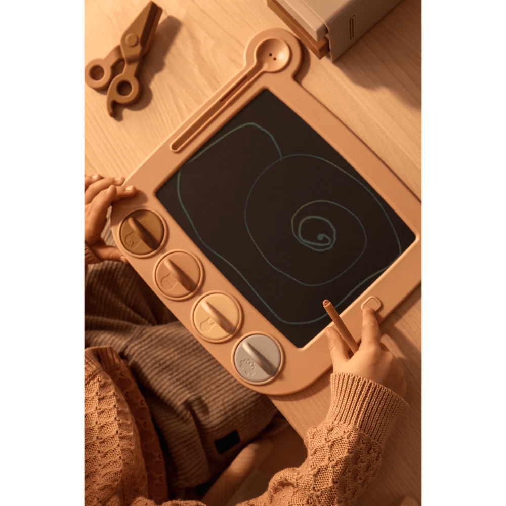 En björnformad LCD-ritbräda designad för oändlig kreativitet, komplett med en penna och fyra roliga silikonstämplar. Lätt och återanvändbar, med ett skärmlås för att spara teckningar, en enkel raderingsknapp och en säker pennhållare – perfekt för fantasin på språng.