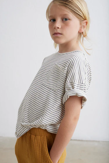 Randig T-shirt i supermjuk, lätt, ekologisk slubbomull. Rund halsringning och lappficka på bröstet. Råkanter vid ärmslut och nederkant. Plaggfärgad. 87% ekologisk bomull, 13% polyester.