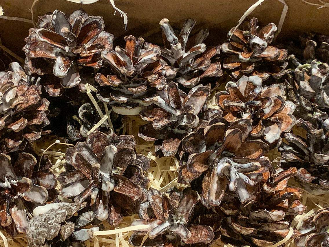 20 st tändkottar i varierande storlek packas i en papplåda med träull.