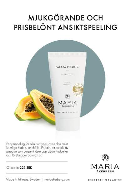 Papaya Peeling är en enzympeeling för ansiktet med Papain, ett extrakt av papaya som varsamt löser upp döda hudceller samt motverkar pormaskar. Det påverkar inte underliggande hud.